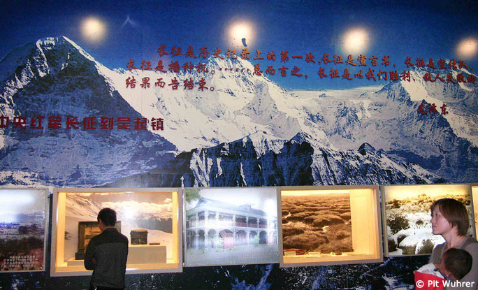 Wenn hier neben den szenischen Nachstellungen der heroischen Schlachten und der nicht minder heldenhaften Bewältigung des Langen Marschs auch andere Menschen Erwähnung finden – wie etwa der kanadische Arzt Norman Bethune, der nach seinem Einsatz für die spanische Republik Verwundete der Roten Armee behandelte –, dann nur, weil sie ins Maos Augen Bestand hatten. Wo derart viel Grösse demonstriert sein will, kommt es auch auf die Stimmigkeit mancher Details nicht an: Im Eingangsbereich der Yan'an-Gedächtnishalle prangt auf einem raumhohen Foto Maos Spruch «Der Lange Marsch hat mit unserem Sieg und des Feindes Niederlage geendet» – dahinter erhebt sich in beeindruckender Grösse nicht das Jinggangshan-Gebirge, sondern das Dreigespann Eiger, Mönch und Jungfrau.