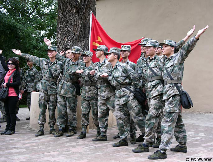 Das Gejohle ist schon von weitem zu hören. Kurz hinter der Kuppe des Huangyangjie-Passes, der Ende der 1920er Jahre heftig umkämpft war, hat ein findiger Geschäftsmann drei Kanonen aufgestellt, aus denen gerade eine chinesische Reisegruppe mit grossem Hallo Tennisbälle abfeuert und jeden Treffer lautstark bejubelt. Es sind Bankangestellte auf Betriebsausflug, gekleidet in hellblaue Militärhosen und -jacken – eine Imitation der Uniform der Ersten Roten Armee aus den dreissiger Jahren –, die am Eingang des Museumsgeländes ausgeliehen werden können.